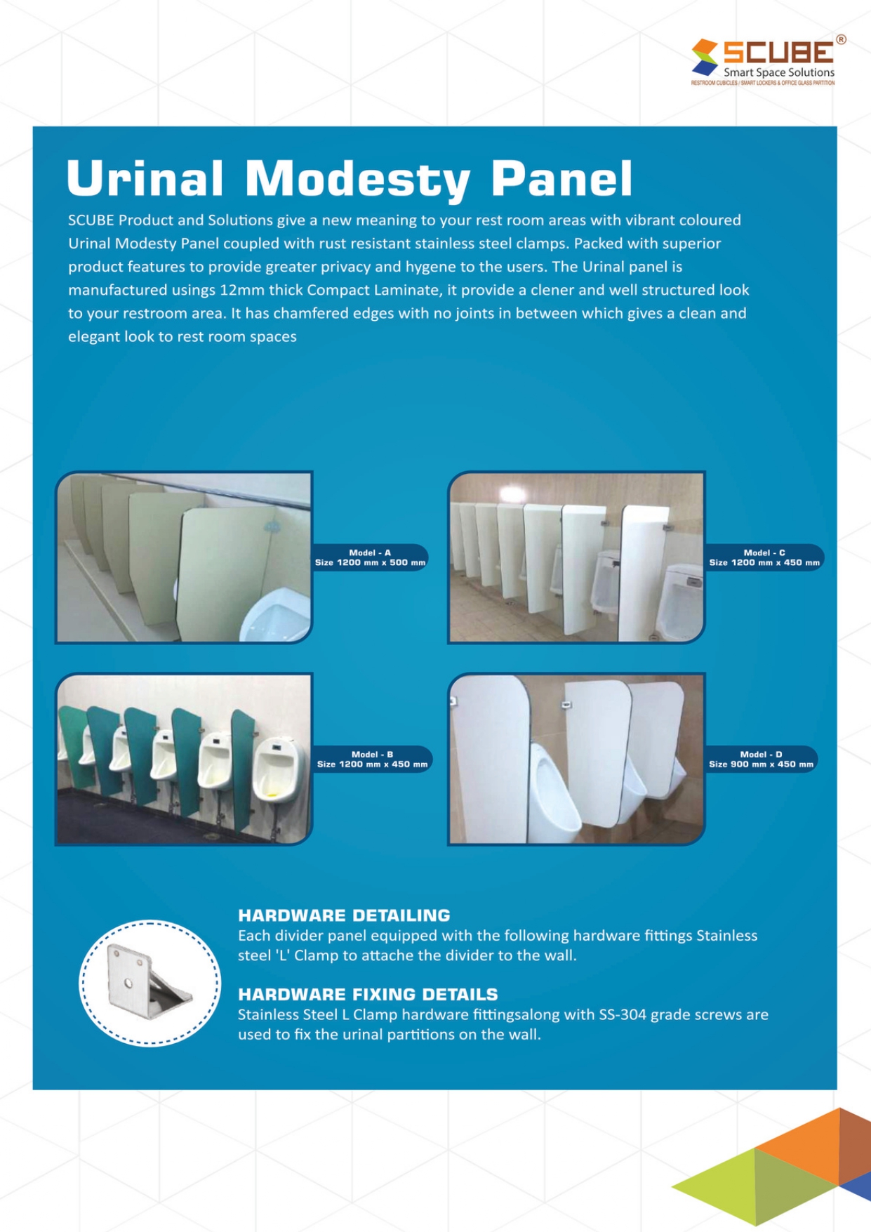 Designed to blend seamlessly with all SCUBE cubicle series, the modesty panel enhances washroom functionality with a clean, minimalist appearance. It is installed between urinals to offer personal privacy while maintaining high hygiene standards.